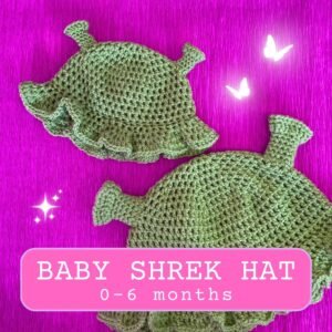 Handmade crochet Shrek hat for babies aged from 0-6 months ish, or a little older as there’s plenty of stretch in the material. Made using super soft acrylic yarn which is gentle on your baby’s skin, and can be washed on a low heat with your usual washing.