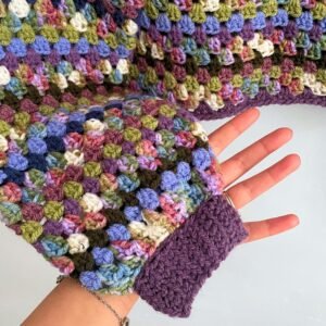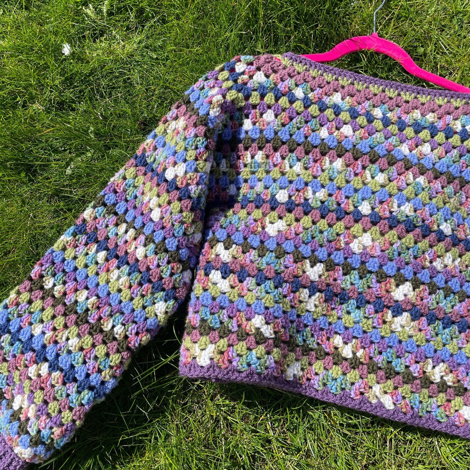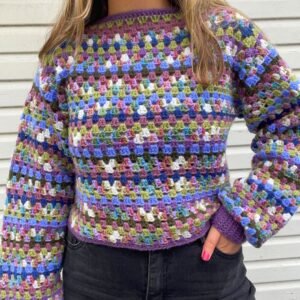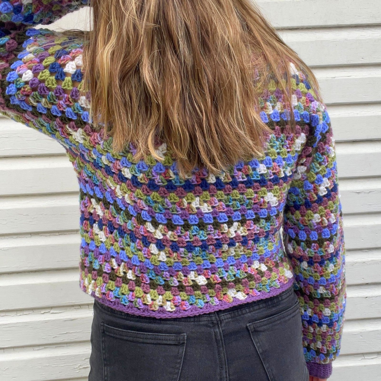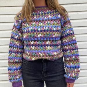 Handmade crochet pacthwork jumper using super soft yellow, orange, indigo and pink acrylic yarn. One-of-one colourful and super wearable piece that is made to fit a UK size 10-16. FREE UK SHIPPING!
