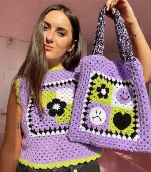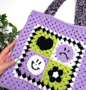 Handmade crochet bag with purple and green happy/sad faces, heart and flower design on one side, and plain on the other. Not lined, however you can use a little makeup bag or purse to store your valuables (coins, keys, phone, etc) if you wish.